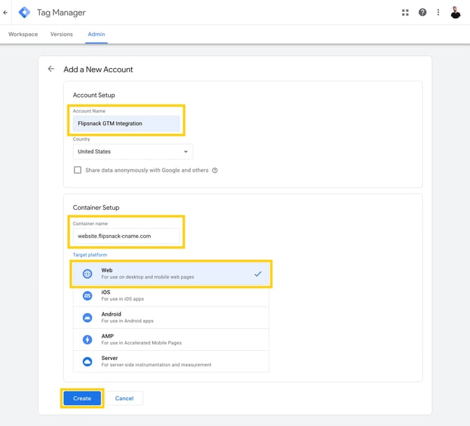Create a new GTM container for Flipsnack