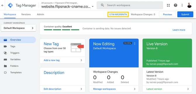 - Copy the GTM Container ID from the Workspace Changes section.