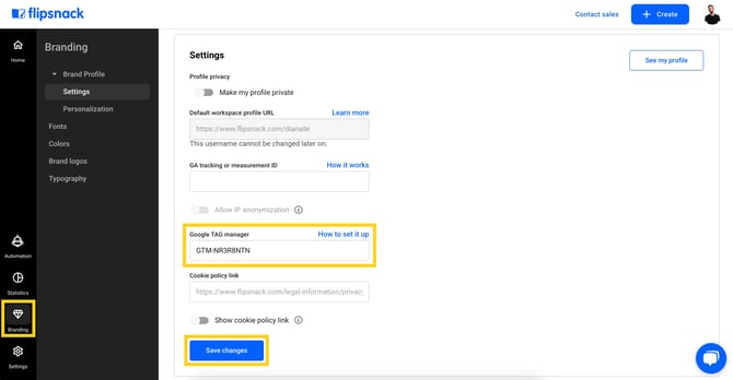 - Add the GTM container ID to your Flipsnack profile