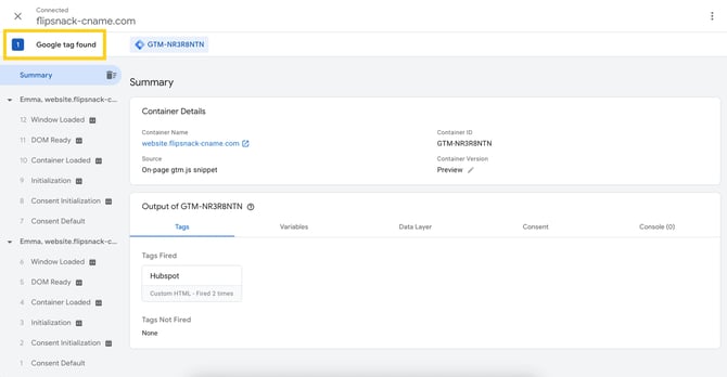 If the setup is correct, a new window will open with your flipbook, and the Tag Assistant box should appear in the bottom right corner, showing that GTM is connected.