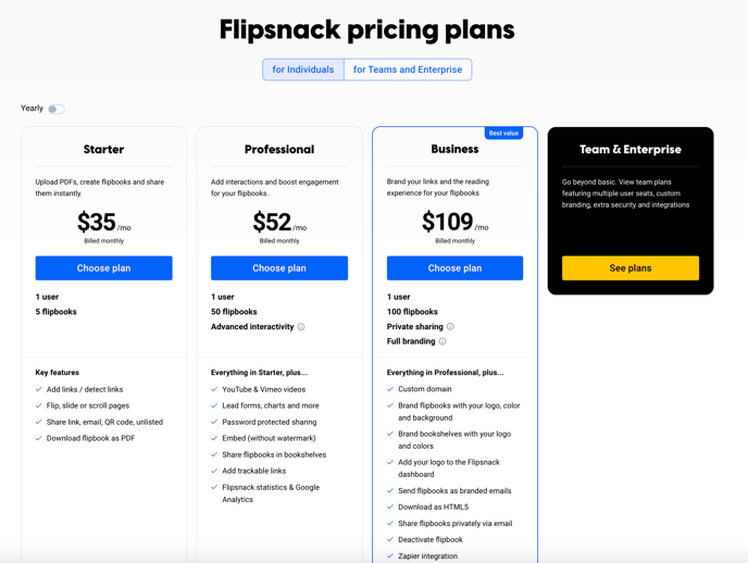 Flipsnack uses a subscription model, offering monthly or yearly plans to fit different needs.